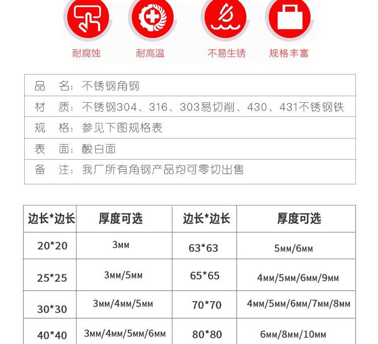 不銹鋼角鋼是兩邊互相垂直成角形的長條鋼材。有等邊不銹鋼角鋼和不等邊不銹鋼角鋼之分。等邊不銹鋼角鋼的兩個邊寬相等。其規(guī)格以邊寬×邊寬×邊厚的毫米數(shù)表示。如“∠25×25×3”,即表示邊寬為 25毫米、邊厚為3毫米的等邊不銹鋼角鋼。也可用型號表示,型號是邊寬的厘米數(shù),如∠2.5#。型號不表示同一型號中不同邊厚的尺寸,因而在合同等單據(jù)上將不銹鋼角鋼的邊寬、邊厚尺寸填寫齊全,避免單獨用型號表示。熱軋等邊不銹鋼角鋼的規(guī)格為2#-20#。