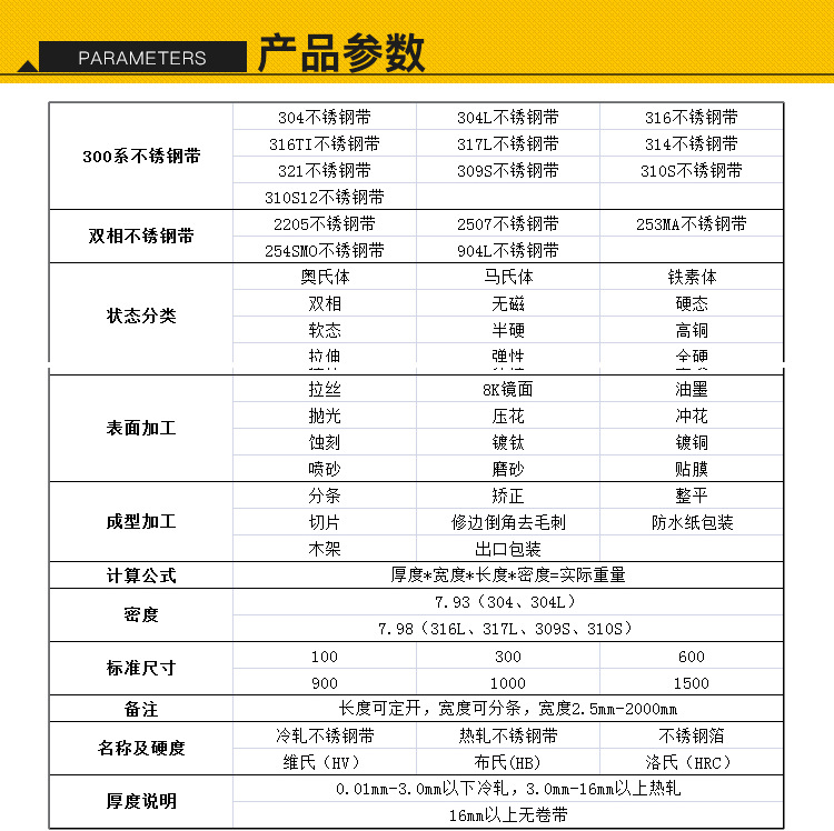 不銹鋼板材主要規格有:厚度0.1mm—4.0mm 寬度3.5mm—1800mm;剪割中厚板件,厚板度4mm—70mm,可剪割各種形狀。備注:可定做可切割可提供樣品,其他要求:可以提供材質證明、SGS報告等。壓延硬料:(0.03mm---3mm) * (2mm-1520mm) * C